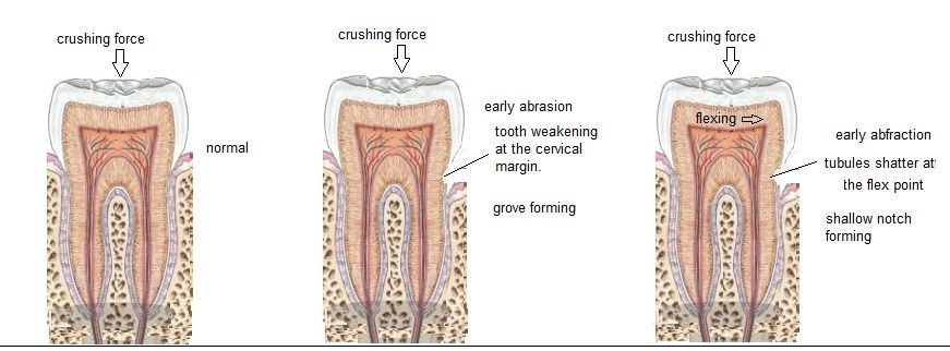 - Erosion - Acid exposure from diet or reflux can also soften enamel, making abrasion and stress-related damage more likely