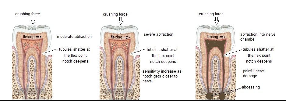 - Abfraction – structural breakdown caused by stress and flexing of the tooth